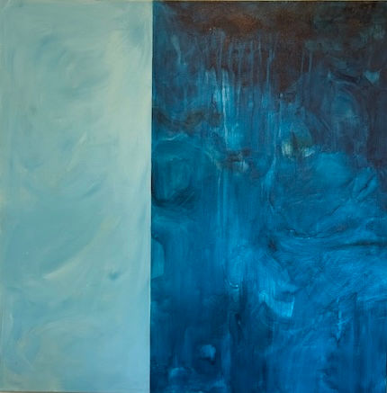 When asked to describe her process, Karen is hesitant. Her art-making is an intuitive process, one that defies words. With that, the artist grabbed a graphite pencil and made several varying strokes onto a canvas standing ready on a nearby easel. No blank canvas phobia here! She turned on some British rock music and, from the moment forward, a dance, both literal and figurative, ensued between artist and canvas. Karen searches for the relationship between each mark, color, shape, and form as it appears on the artwork in process. It seemed like a friendly fencing match with Karen in competition with a benign opponent, her canvas. She advises other artists to make their studios “guilt -free zones” places that encourage spontaneity.
